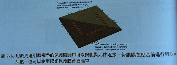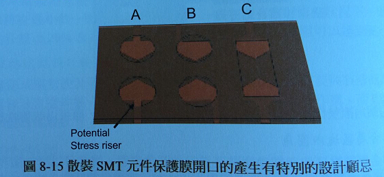 使用鉆孔或開槽、切形在壓合前將保護膜加工,是軟板制造焊錫襯墊近接區(qū)域的普遍方法。不過如果直接布線進入襯墊,保護膜對位不良可能導至應(yīng)力提升。圖8-15(A)中,潛在的應(yīng)力提升狀況還是重覆出現(xiàn)。邊緣或轉(zhuǎn)角進入襯墊有利于對位偏移的容忍度(圖8-15(B))。雷射切割或機械沖壓、切形加工的保護膜開口,可以做成矩形(圖8-15(C))。