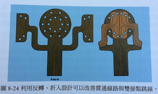 在連接器線路方面,各個線路向外布局逐漸變寬而可以獲得更大通孔設(shè)計(jì)孔圈與襯墊寬容性,因此消耗了更多的繞線面積。多層堆疊階梯式處理不論是否有長短插梢處理,都是一種直接解決端子區(qū)域問題的方法,但是在各層貼合后需要進(jìn)行檢驗(yàn)同時有可能會沾黏異物,迫使需要采用昂貴的重工。折入與折入反轉(zhuǎn)的技術(shù),如圖8-24所示,可以幫助處理連接器位置問題。但是因?yàn)樾枰炊穆懵督Y(jié)構(gòu)而會讓制作成本提高,同時可能會降低單片板可以配置的板量。