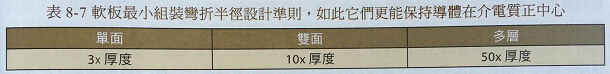 在每片柔性線路板上如果只在組裝時發(fā)生彎折,考慮采用最小彎折半徑可能是個好主意,一般的柔性線路板彎折半徑參考數(shù)據(jù),如表8-7所示。設(shè)計時應(yīng)該建構(gòu)出足夠的回線區(qū),并配置挖空的貼裝孔讓柔性線路板產(chǎn)生緩和曲線。