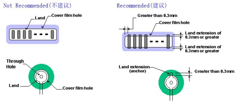 通孔的焊墊必須用 Cover film覆蓋住,以避免使用時剝落。