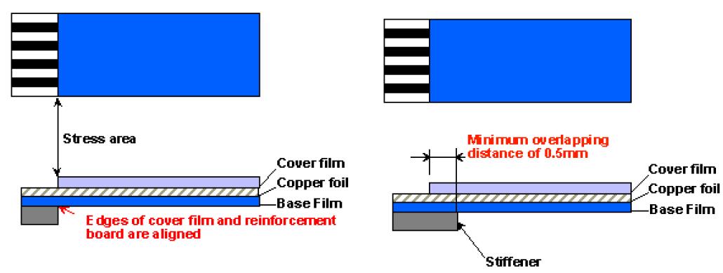 如果軟板有彎折的需要時,建議Cover Film必須覆蓋過彎折處,以避免線路折斷。
