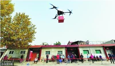 2016年11月10日,西安市長(zhǎng)安區(qū)杜曲街辦西樊村村民迎來(lái)京東無(wú)人機(jī)配送的西北首單“快遞”。