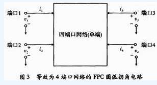 為了分析其全波傳輸特性,輸入輸出的電壓電流可用一個(gè)4端口網(wǎng)絡(luò)來(lái)描述,其等效形式如圖3所示。