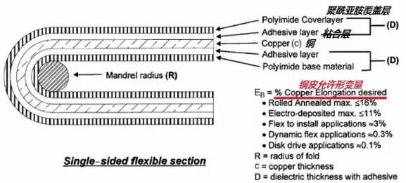 而且在不同的使用場合,同一材料的銅皮變形量取值也不一樣。對于一次性彎曲的的場合,使用折斷臨界狀態(tài)的極限值(對延碾銅,該值為16%)。對于彎曲安裝設(shè)計(jì)情況,使用IPC-MF-150規(guī)定的最小變形值(對延碾銅,該值為10%)。對于動態(tài)柔性應(yīng)用場合,銅皮變形量用0.3%。而對于磁頭應(yīng)用,銅皮變形量用0.1%。通過設(shè)置銅皮允許的變形量,就可以算出彎曲的最小半徑。