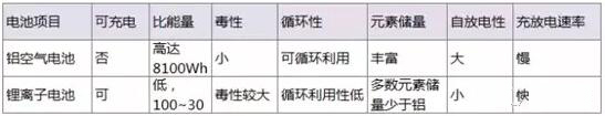鋁空氣電池與現(xiàn)今的鋰離子電池相比的優(yōu)劣如下表所示。