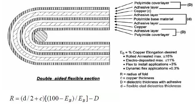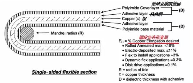 而且在不同的使用場(chǎng)合,同一材料的銅皮變形量取值也不一樣。對(duì)于一次性彎曲的的場(chǎng)合,使用折斷臨界狀態(tài)的極限值(對(duì)延碾銅,該值為16%)。對(duì)于彎曲安裝設(shè)計(jì)情況,使用IPC-MF-150規(guī)定的最小變形值(對(duì)延碾銅,該值為10%)。對(duì)于動(dòng)態(tài)柔性應(yīng)用場(chǎng)合,銅皮變形量用0.3%。而對(duì)于磁頭應(yīng)用,銅皮變形量用0.1%。通過設(shè)置銅皮允許的變形量,就可以算出彎曲的最小半徑。