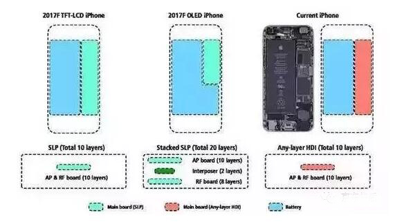 同樣是4.7寸,電池容量怎么做到增加獎(jiǎng)金1000mAh?據(jù)分析師說(shuō),蘋果會(huì)在iPhone 8身上采用堆疊式類板(Substrate-like PCB/SLP),可以堆上多達(dá)20層,從而大大減小主板面積,將更多內(nèi)部空間留給電池。
