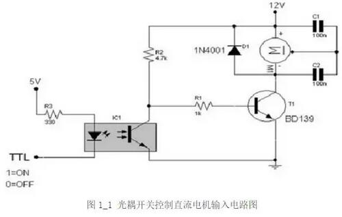 光耦(opticalcoupler)亦稱光電隔離器、光耦合器或光電耦合器。它是以光為媒介來傳輸電信號的器件,通常把發(fā)光器(紅外線發(fā)光二極管LED)與受光器(光敏半導體管)封裝在同一管殼內(nèi)。當輸入端加電信號時發(fā)光二極管發(fā)出光線,光敏三極管接受光線之后就產(chǎn)生光電流,從輸出端流出,從而實現(xiàn)了“電—光—電”轉(zhuǎn)換。典型應用電路如下圖1-1所示。