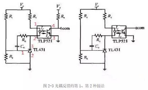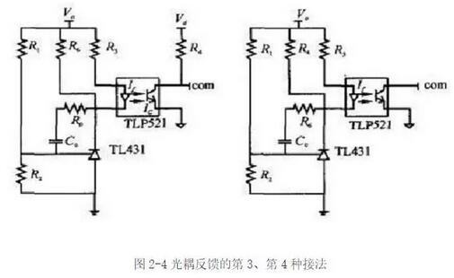 常見的光耦反饋第1種接法。Vo為輸出電壓,Vd為芯片的供電電壓。com信號接芯片的誤差放大器輸出腳。注意左邊的地為輸出電壓地,右邊的地為芯片供電電壓地,兩者之間用光耦隔離。圖2-3所示接法的工作原理如下:當輸出電壓升高時,TL431的1腳(相當于電壓誤差放大器的反向輸入端)電壓上升,3腳(相當于電壓誤差放大器的輸出腳) 電壓下降,光耦TLP521的原邊電流If增大,光耦的另一端輸出電流Ic增大,電阻R4上的電壓降增大,com引腳電壓下降,占空比減小,輸出電壓減?。环粗?,當輸出電壓降低時,調(diào)節(jié)過程類似。