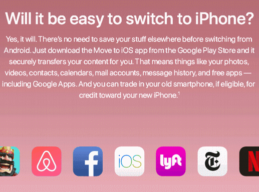 蘋果:“我們早就在Google play上架了數據轉移APP,你在安卓設備上的任何信息都能快速且安全的轉移到iPhone上”。
