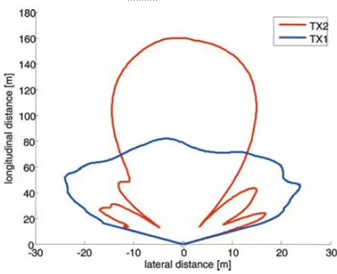 兩組發(fā)射天線分別負責(zé)探測近處和遠處的目標(biāo),其覆蓋范圍如下圖所示: