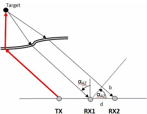 其中方位角αAZ可以通過兩個接收天線RX1和RX2之間的幾何距離d以及兩天線收到雷達回波的相位差b通過簡單的三角函數(shù)計算得到。