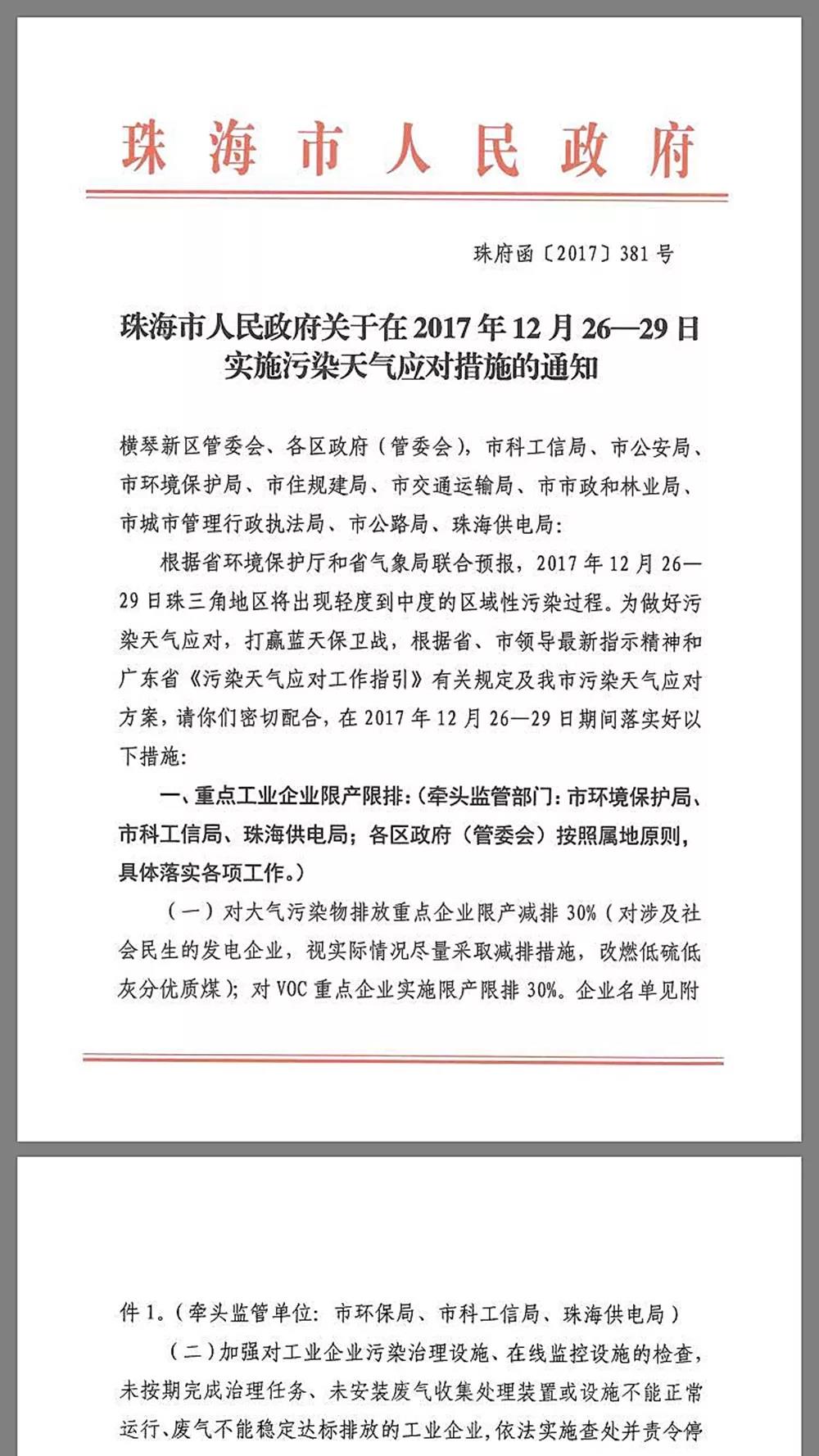 藍天保衛(wèi)戰(zhàn)全面打響!12月26日,軟板廠小編看到珠海市人民政府發(fā)布了《珠海市人民政府關(guān)于在2017年12月26-29日實施污染天氣應(yīng)對措施》的通知,通知表示,根據(jù)省環(huán)境保護廳和省氣象局聯(lián)合預(yù)報,2017年12月26-29日珠三角地區(qū)將出現(xiàn)輕度到中度的區(qū)域性污染過程。為做好污染天氣應(yīng)對,他們在2017年12月26-29日將落實以下措施:對重點工業(yè)企業(yè)限產(chǎn)限排(對大氣污染物排放重點企業(yè)限產(chǎn)限排30%;對VOC重點企業(yè)實施限產(chǎn)限排30%);在建項目停工;限車以及采取其他緊急應(yīng)對措施等。