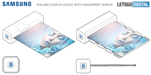 該專利顯示了圓柱形和正方形的形狀。兩種都具有指紋傳感器,使用者只需用指紋激活就能展開(kāi)卷曲的顯示屏。