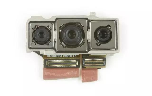 拆下主板屏蔽層之后可以看到華為P20 Pro最強悍的三攝像頭模組了,此次華為將三顆攝像頭都設計成同一個模塊,并且還是緊挨著主板上的,而閃光燈也是被后置三攝給拖拽著。
