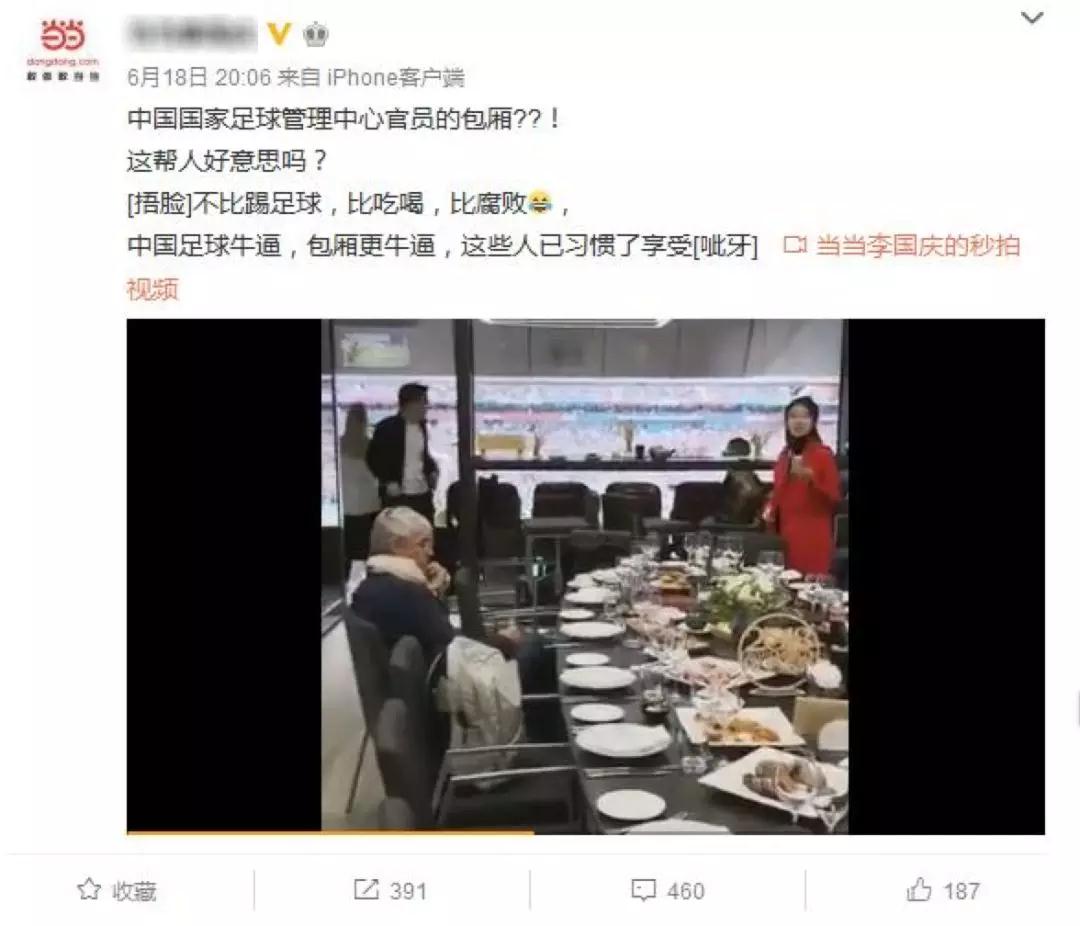 6月18日,網(wǎng)絡(luò)上有人曬出名帥米盧和幾位中國人在世界杯的包廂內(nèi)用餐的視頻,并稱足球管理中心官員伙同米盧在世界杯豪華包廂大吃大喝。一時間,足協(xié)又被推到了風(fēng)口浪尖。