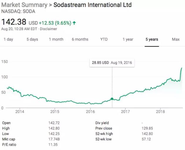 CNN的報道中稱,收購SodaStream將進一步提升百事公司對健康產(chǎn)品的定義。此外,自從SodaStream將自身品牌重新定位為一家蘇打水公司后,股價在過去的兩年中累計飆升了逾320%。