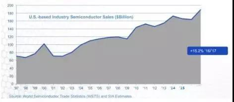 據(jù)統(tǒng)計,總部位于美國的半導體公司的銷售額在1997年的時候僅為709億美元,到了2017年,這個數(shù)字已經(jīng)飆升到18890億美元,年平均符合增長率達到5.02%。我們從總部位于美國的半導體公司的銷售額變化可以看到半導體產(chǎn)業(yè)的周期性波動特征。