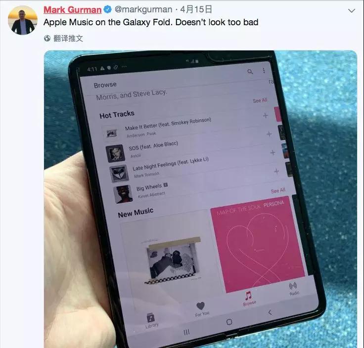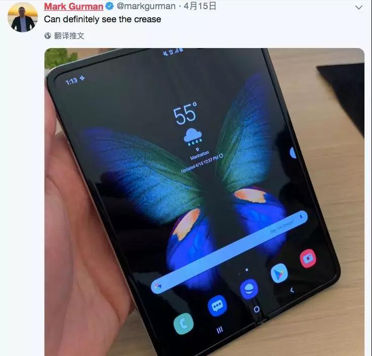 4月15日,Mark Gurman拿到了這款手機(jī),雖然兩塊屏幕中間的折痕比較明顯,但用起來還算不錯。