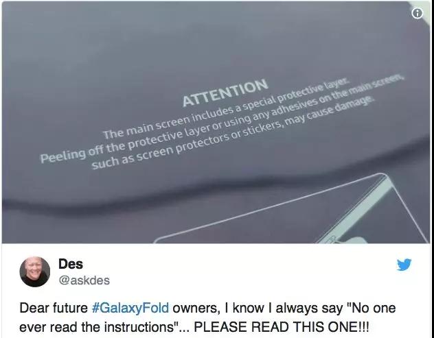 隨后,三星方面也回復(fù)稱,這層保護(hù)膜是手機(jī)屏幕的一部分,是為了防止屏幕被劃傷。同時,公司還將保證消費(fèi)者能夠看到這條警告信息。