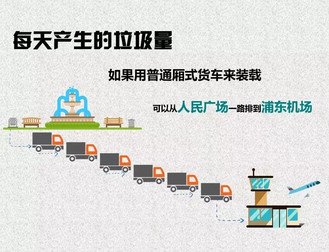 有數(shù)據(jù)顯示,2018年,上海市每天生活垃圾清運(yùn)量接近2.6萬噸,年均生活垃圾產(chǎn)生量超過900萬噸。粗略估算,如果用2.5噸卡車來運(yùn)送,上海每天產(chǎn)生的生活垃圾,所需車輛頭尾銜接便可繞上海內(nèi)環(huán)一圈。