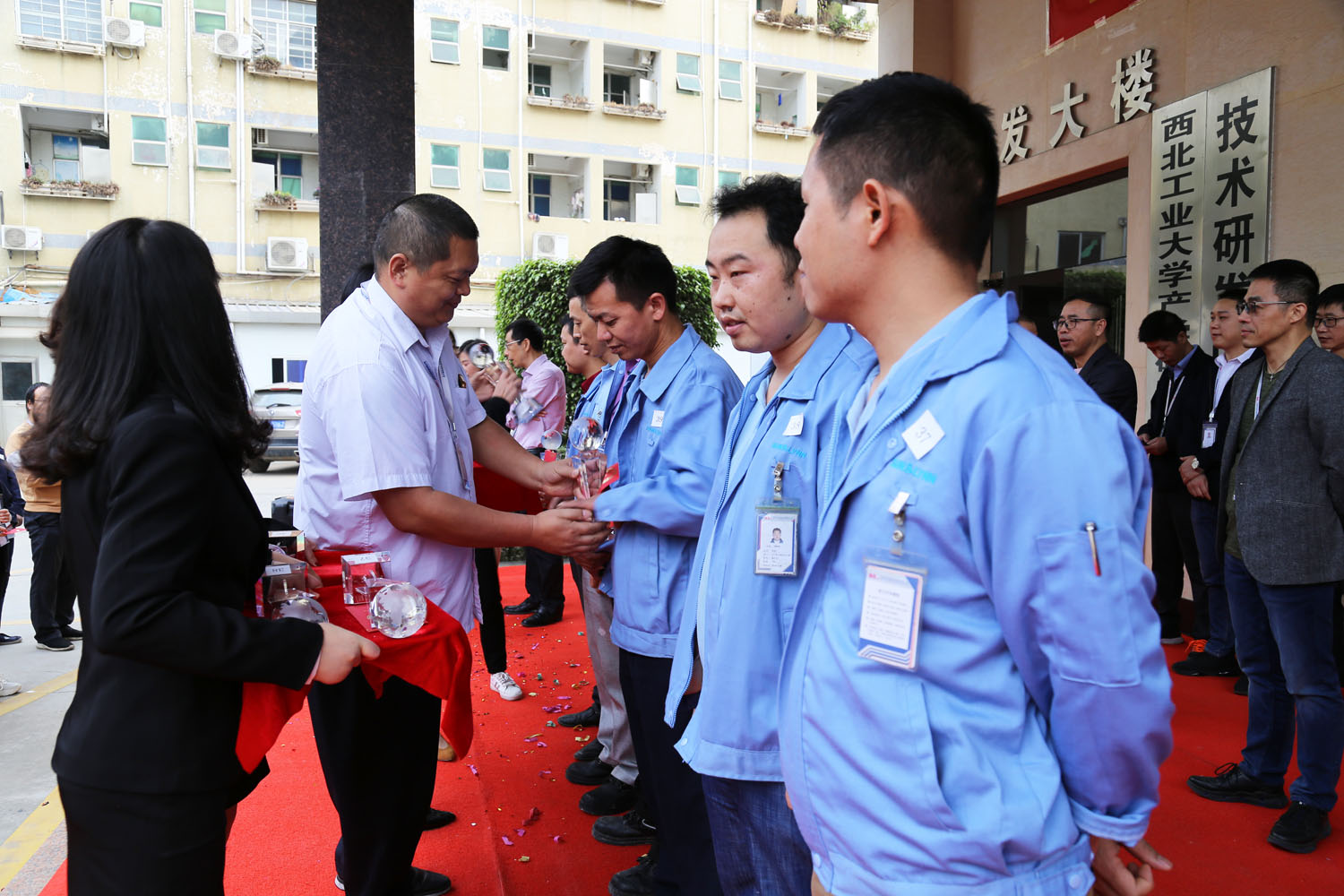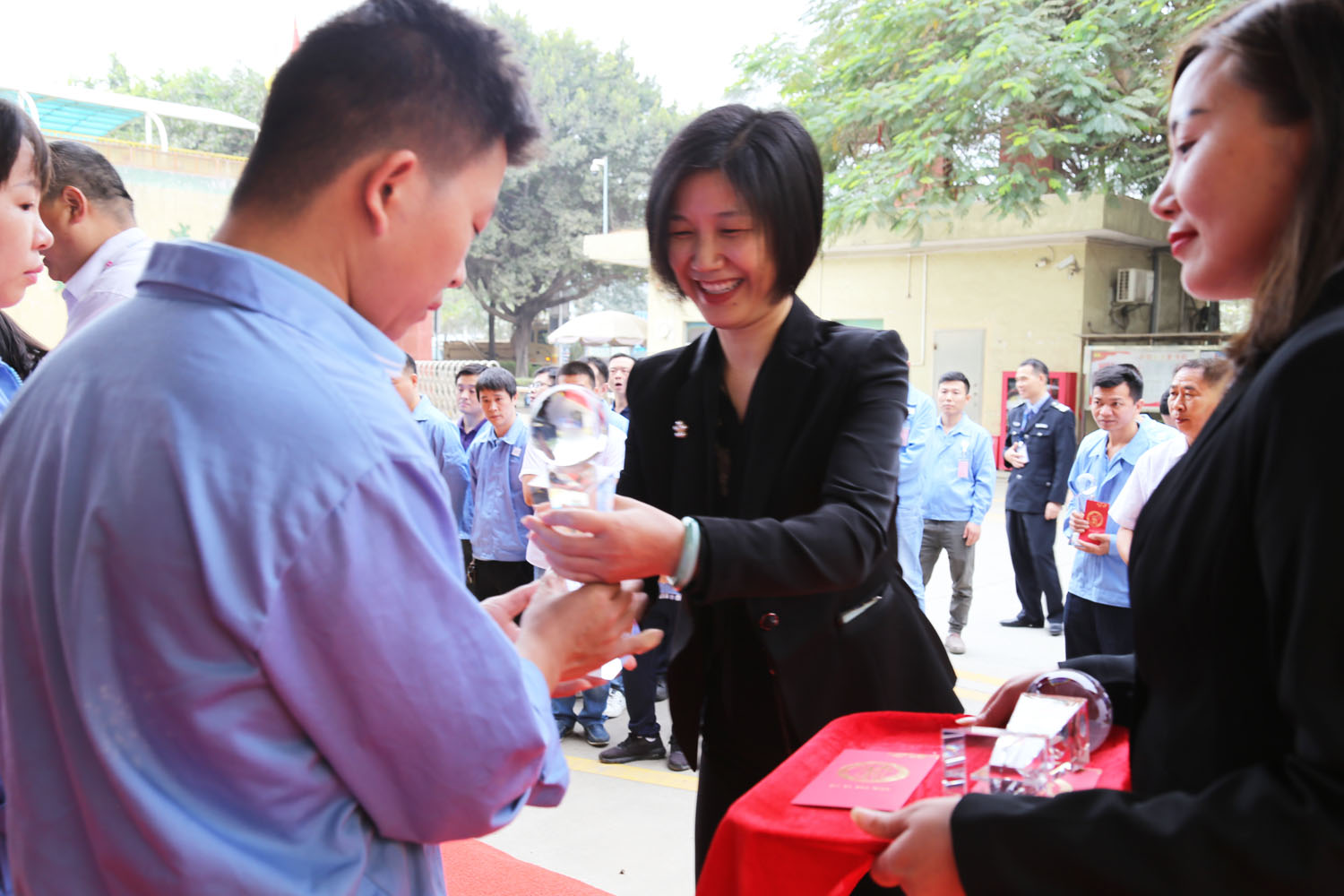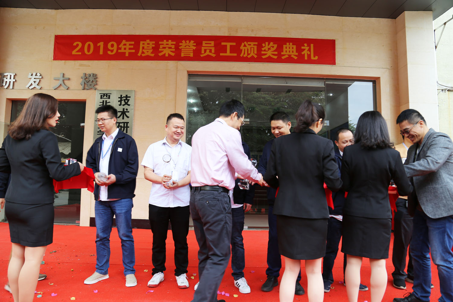 激情昂揚(yáng)的音樂聲響起,各領(lǐng)導(dǎo)一起為70名職工頒發(fā)榮譽(yù)員工獎(jiǎng)杯和紅包,大家臉上都洋溢著幸福的笑容。