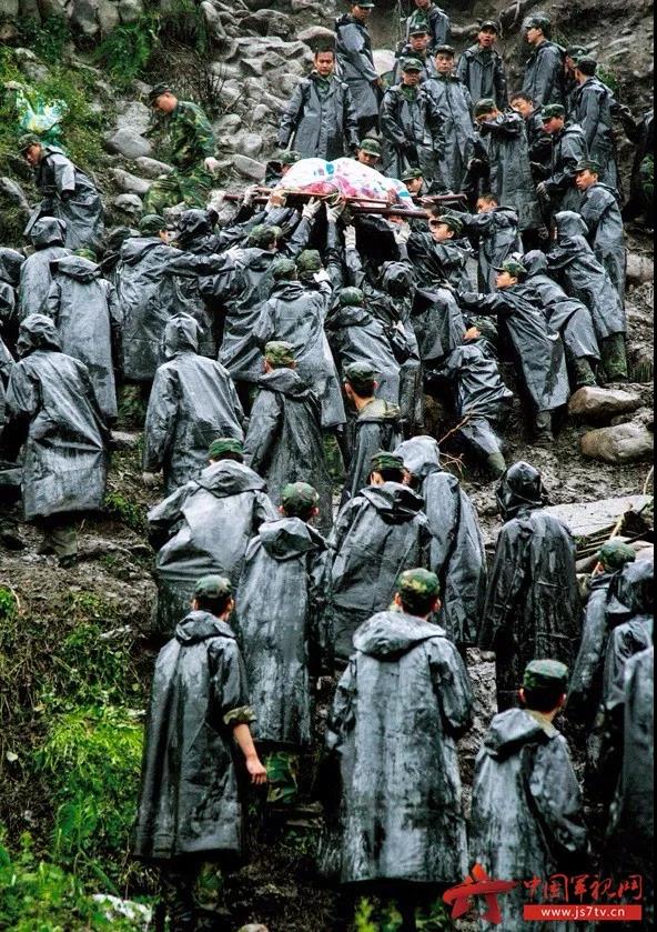 ▲令人難忘的照片《眾志成城 托舉生命》。山體垮塌,亂石滾成了陡坡,一條轉(zhuǎn)移被困人員的必經(jīng)之路被埋,再加上泡了一天一夜的雨,泥濘難行。在轉(zhuǎn)移被困人員時(shí),救援官兵用身體搭起人梯,把生命高高舉過頭頂。