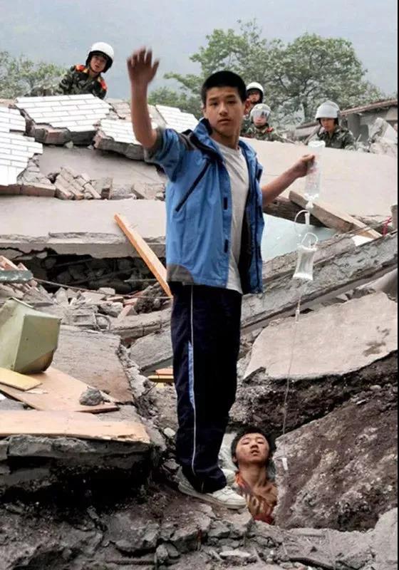 ▲2008年5月15日,綿竹市漢旺東汽中學(xué),災(zāi)難過去80個(gè)小時(shí),男孩終于被救援人員抬出廢墟。他說,“叔叔,我想喝可樂”。
