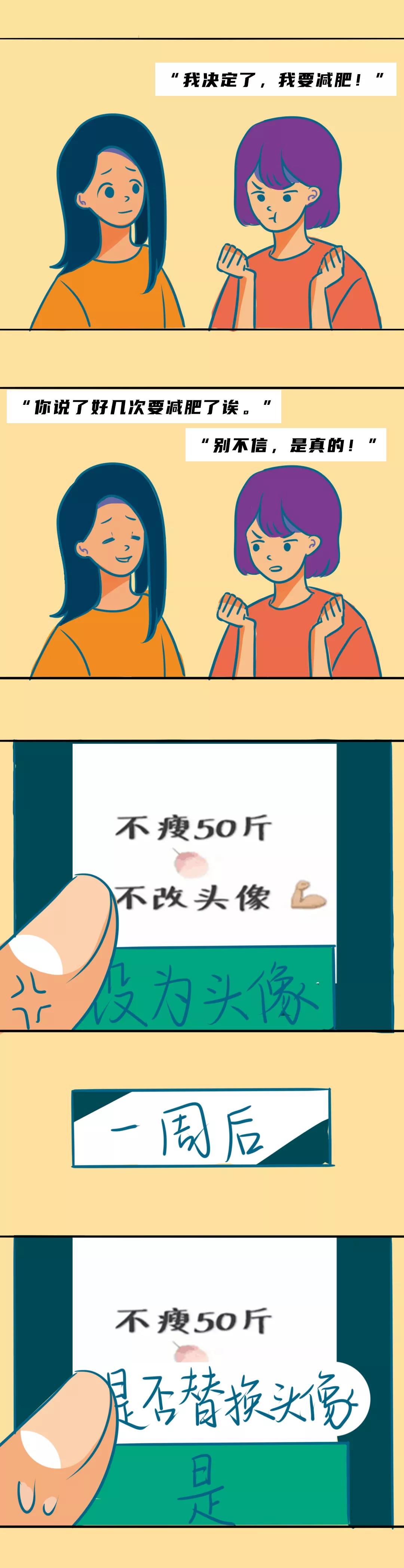 相信好多人都見(jiàn)過(guò)那種非常勵(lì)志的頭像:全都是“不瘦??斤不換頭像!”。但沒(méi)過(guò)幾天,你就會(huì)發(fā)現(xiàn),這個(gè)曾經(jīng)激勵(lì)人的頭像不見(jiàn)了——被悄無(wú)聲息地?fù)Q了下來(lái),然而那時(shí)候并沒(méi)有瘦多少斤!