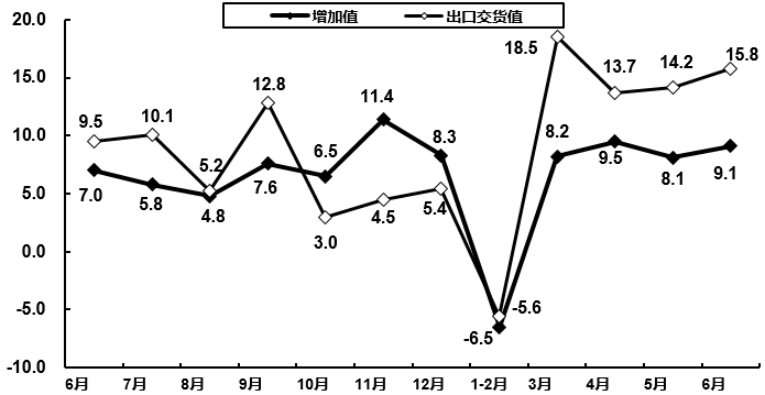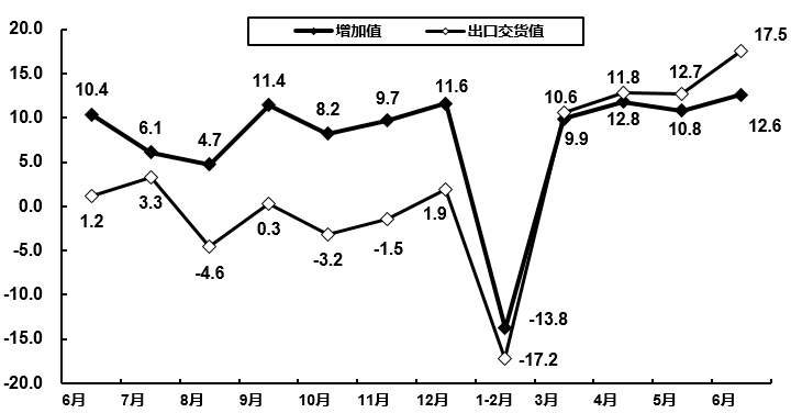 2020年6月電子信息制造業(yè)增加值和出口交貨值分月增速(%)
