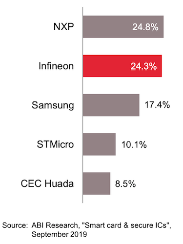 上圖是芯片卡半導體五強:恩智浦、英飛凌、三星、意法和華大。華大主要由華虹代工。