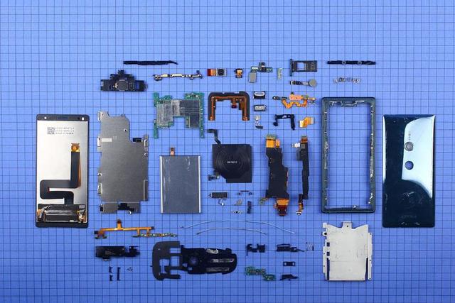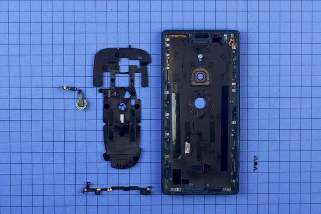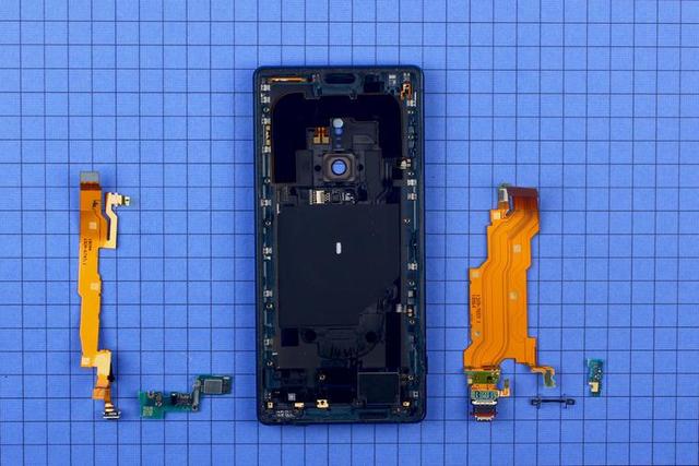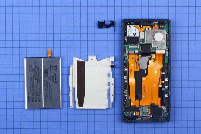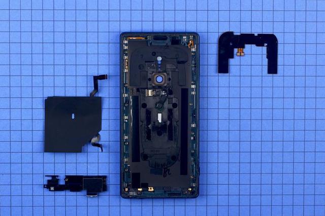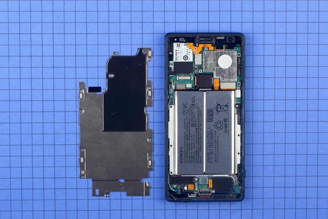 擰下螺絲將蓋板取下,內(nèi)部結(jié)構(gòu)盡在眼前。盡管要從屏幕開(kāi)始拆起,但 Xperia XZ2 采用的依然是安卓手機(jī)非常常見(jiàn)的三段式結(jié)構(gòu), BTB 連接板被設(shè)計(jì)到電池下方,使得整體觀(guān)感變得整齊劃一。