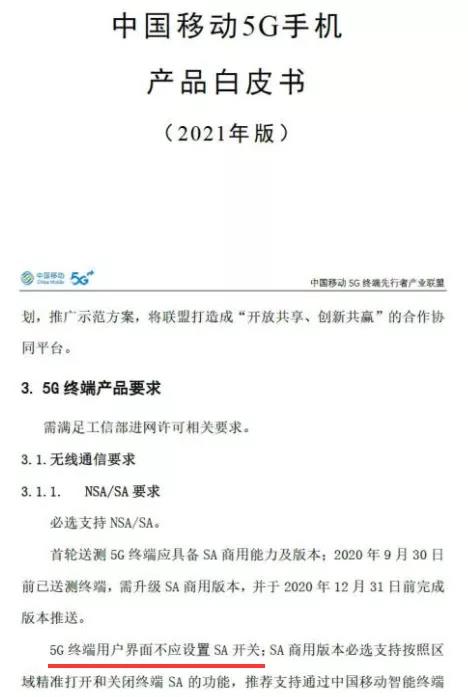 中國移動更是不講武德,甚至還要求:手機系統(tǒng)中不應(yīng)設(shè)置 SA 開關(guān)。