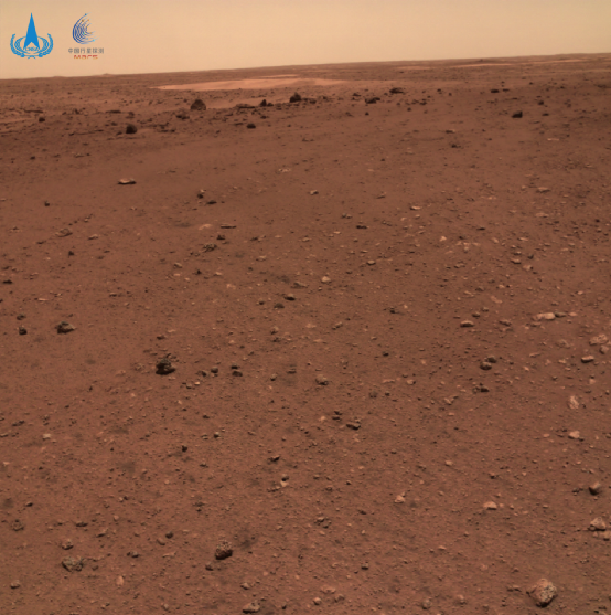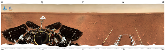 當(dāng)祝融號(hào)尚未駛離著陸平臺(tái)時(shí),先由桅桿上的導(dǎo)航地形相機(jī)進(jìn)行360°環(huán)拍,經(jīng)過(guò)校正和鑲嵌拼接而成了這張全景圖。圖像顯示,著陸點(diǎn)附近地勢(shì)平坦,遠(yuǎn)處可見火星地平線,石塊豐度和尺寸與預(yù)期一致,表明著陸點(diǎn)自主選擇和懸停避障實(shí)施效果良好。