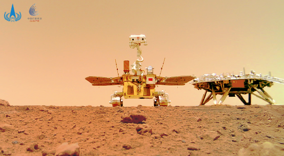 這是“祝融號(hào)”火星車行駛至著陸平臺(tái)南向約10米處,釋放安裝在車底部的分離相機(jī),之后火星車退至著陸平臺(tái)附近。分離相機(jī)拍攝了火星車移動(dòng)過(guò)程和火星車與著陸平臺(tái)的合影。圖像通過(guò)無(wú)線信號(hào)從分離相機(jī)傳送給火星車,再由火星車通過(guò)環(huán)繞器中繼傳回地面。