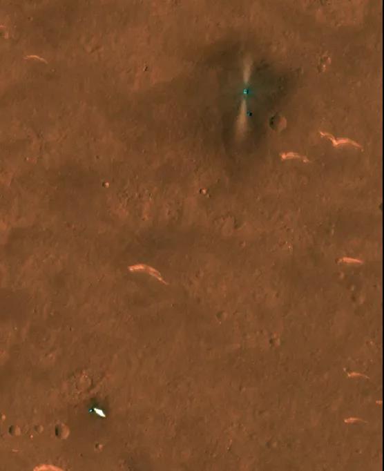 除了祝融號(hào)自己拍攝的圖片外,近期美國(guó)的MRO火星軌道器搭載的HiRise相機(jī)也捕捉到了祝融及著陸平臺(tái)。