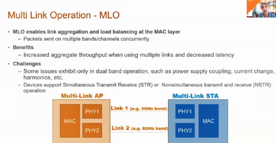Wi-Fi 7引入的一個新特性就是上面提到的多鏈路操作(MLO),執(zhí)行MLO時,多個鏈路公用MAC網絡層,并采用單獨的物理層,這樣支持該特性的AP還是基站都能在多個頻段上同時執(zhí)行發(fā)射或接收操作,比如5GHz和6GHz。這樣極大地增加了吞吐量,同時降低了延遲。
