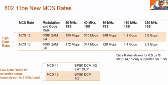 在802.11ax標準中,已經為20MHz至160MHz的信道定義了12個MCS速率,而Wi-Fi 7在4096QAM調制方式的支持下,引入了速率更高的MCS 12和MCS 13。如果采用320MHz的信道,那么單條空間流上的速率最高可至2.9Gbps。