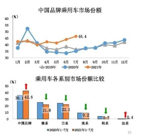 值得被關(guān)注的是,中國品牌乘用車市場份額繼續(xù)上升??梢钥吹剑?月中國品牌乘用車銷量為72萬輛,同比增長22.2% ,所占市場份額達(dá) 46.4%,上升11.1個百分點;1-7月累計銷量為492萬輛,同比增長42.8%,所占市場份額為 42.6%,同比上升6.5個百分點。