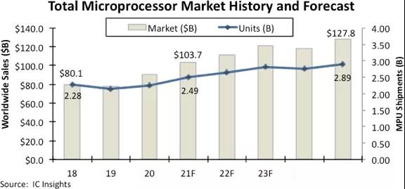 IC Insights在最近發(fā)布的《2021年麥克林報告》年中更新中表示,現(xiàn)在預(yù)計MPU銷售額將在2021年增長14%,這將使微處理器市場總額達到創(chuàng)紀(jì)錄的 1037億美元,而此前預(yù)計的增長為9%。