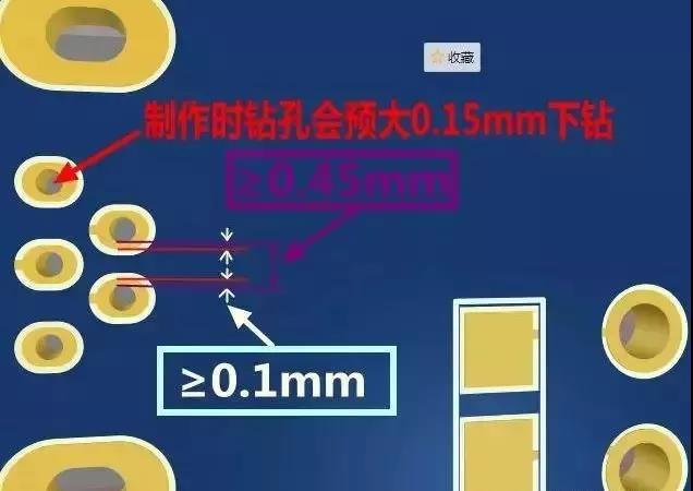 插件孔與插件之間的間距:孔邊緣間距≥17mil(0.45mm),極限為12mil。插件孔汽車FPC制作時鉆孔會預大0.15mm下鉆,鉆完后再沉上銅,最終保證沉銅后的孔徑與汽車FPC設計時的成品孔一樣大。(孔邊緣間距0.45=0.15孔補償 + 0.1孔環(huán)+ 0.1 孔環(huán) + 0.1 安全間距 ,單位mm)