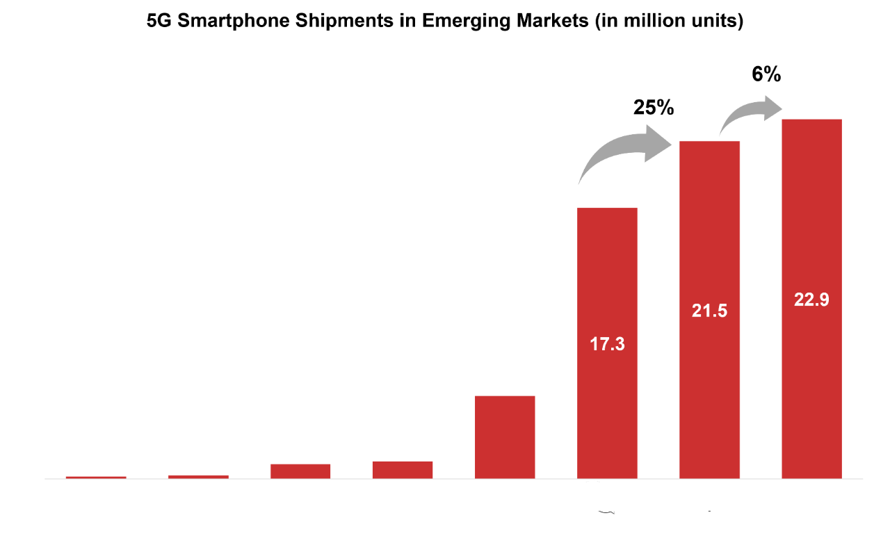 在智能手機(jī)成熟市場,消費者已經(jīng)對5G形成認(rèn)知,認(rèn)為新的智能手機(jī)產(chǎn)品理所應(yīng)當(dāng)支持5G功能。這種觀念還沒有得到大多數(shù)新興市場消費者的認(rèn)可。不過,新興市場卻具有最大5G增長潛力。