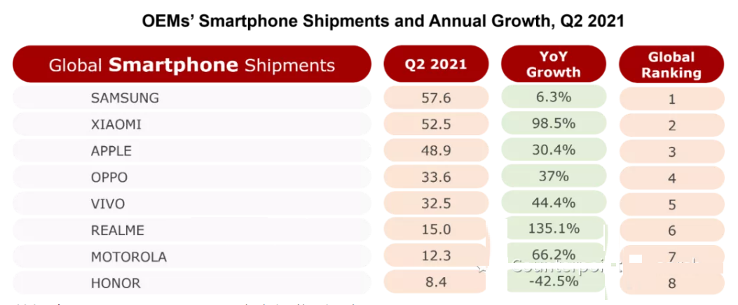新興市場5G智能手機(jī)出貨量的快速增長可以歸功于iPhone 12,這是蘋果首款支持5G的智能手機(jī)產(chǎn)品。于此同時,其他OEM廠商,如OPPO、vivo、小米和realme在入門級的細(xì)分市場中加大了5G產(chǎn)品的部署。在新興市場,特別是東南亞和中東地區(qū),5G基礎(chǔ)設(shè)施建設(shè)方面正在迎頭趕上,因此在未來幾個季度,這些國家對入門級5G手機(jī)的需求將會不斷增加。