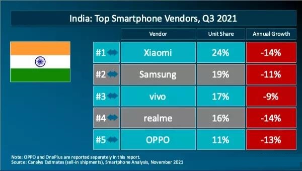 近日市場研究機(jī)構(gòu) Canalys 公布了 2021 年第三季度全球智能手機(jī)出貨的詳細(xì)數(shù)據(jù)。該季度全球共出貨 3.26 億部智能手機(jī),較上一季增長 3%。其中三星以 6940 萬臺的出貨量領(lǐng)先,市場占比 21%;蘋果共出貨 4920 萬臺手機(jī)排名第二,而小米出貨 4400 萬臺排名第三,市場占比 14%。在全球范圍,vivo、OPPO 分別位列第四、第五名。
