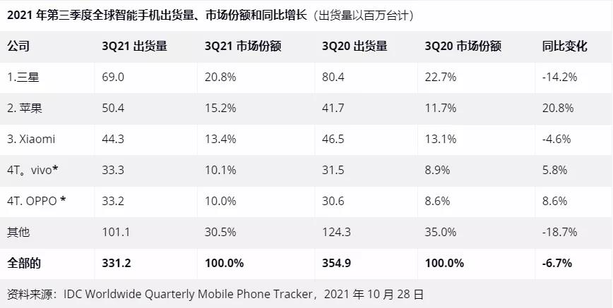 先來看整體情況,由于受到缺芯或其它元器件的影響,第三季度手機(jī)總出貨量3.312億部,同比下滑6.7%,比之前預(yù)期的還要低。