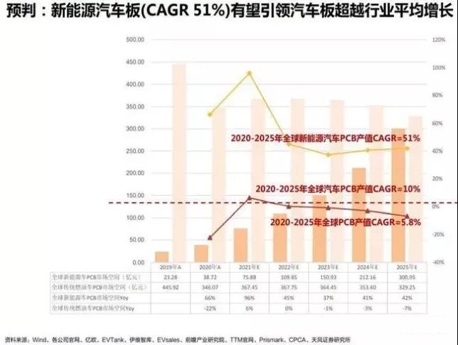 汽車四化帶動(dòng)汽車板空間擴(kuò)大:汽車FPC PCB有望實(shí)現(xiàn)超越行業(yè)平均增速增長,預(yù)計(jì)新能源汽車板2020~2025年市場(chǎng)空間CAGR為51%。
