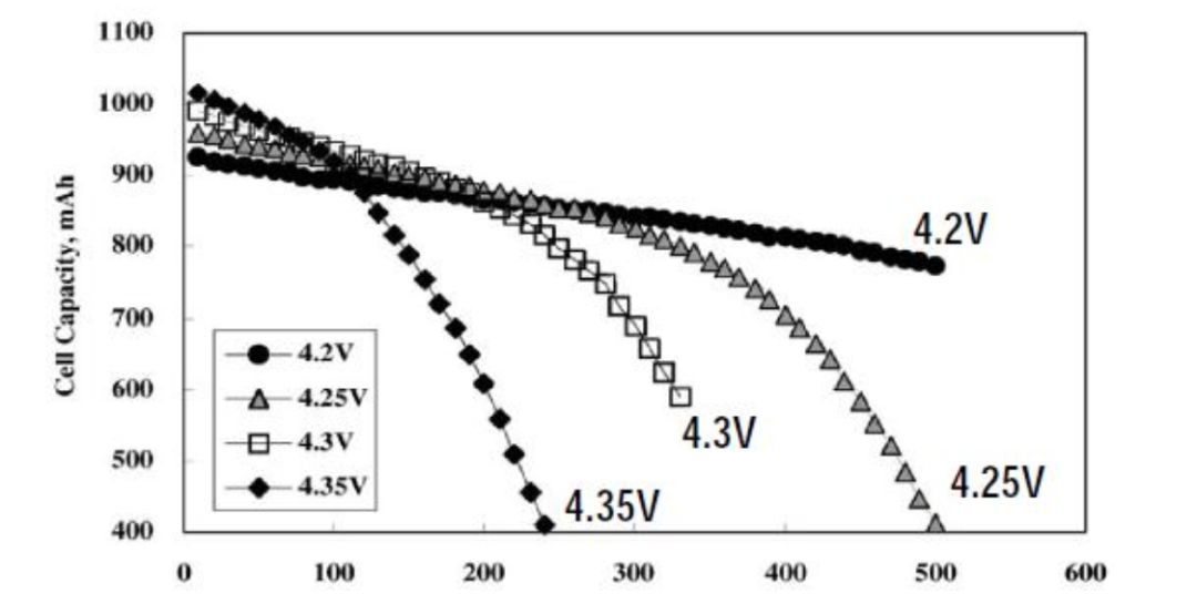 下圖為鋰離子電池的容量、循環(huán)壽命和充電電壓之間的關(guān)系,縱軸為電池容量,橫軸為循環(huán)壽命次數(shù)??梢钥闯?,充電截止電壓越高,循環(huán)壽命更短,容量下降也更快。
