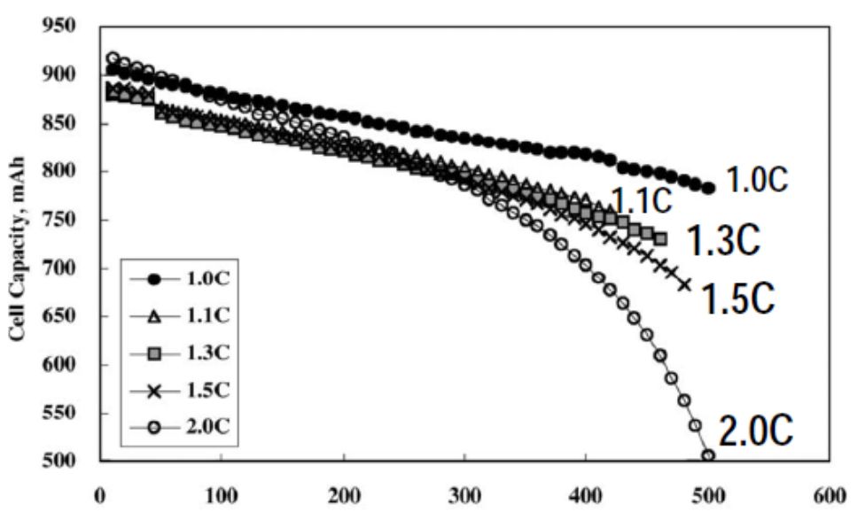 下圖為鋰離子電池的容量、循環(huán)壽命和放電電流之間的關(guān)系,縱軸為電池容量,橫軸為循環(huán)壽命次數(shù)。可以看出,對于充電速率越大,容量衰減速度越快。