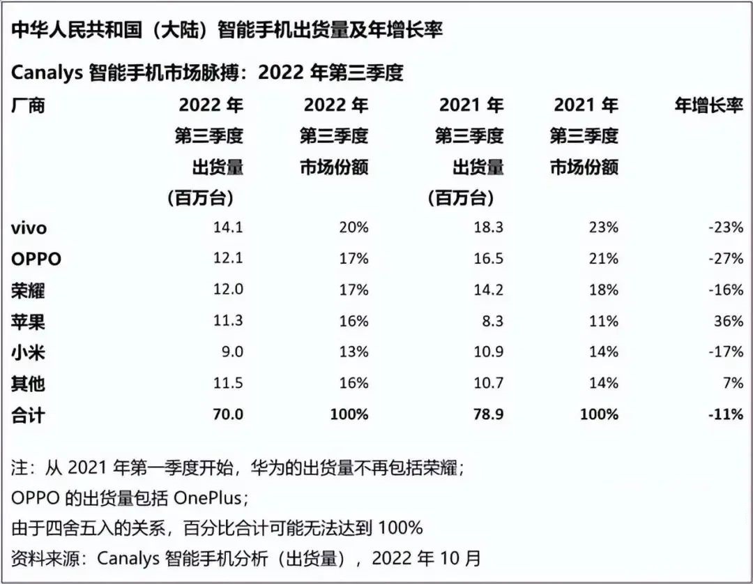 OPPO 2022年第三季度在中國智能手機市場出貨量1080萬臺,同比下降27.9%,市場份額16.3%排名第三。