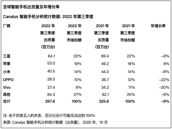 2022年第三季度全球智能手機出貨量同比下降12%,為3.01億部。